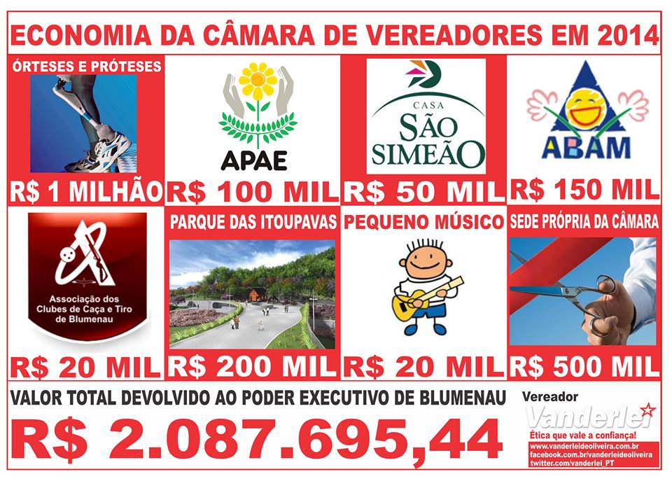 Nesta semana o Executivo municipal entregou às entidades de #BlumenauR$ 300 mil, que se refere a dinheiro economizado pela Câmara de Vereadores em 2014, durante minha presidência na Casa Legislativa. Espero que em breve as demais indicações dos parlamentares sejam executadas! SAIBA + http://bit.ly/1F7h8Kh