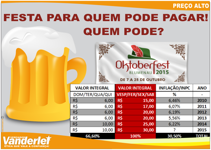 O vereador Vanderlei de Oliveira (PT) afirmou que muito se ouve falar do pacto federativo e da voracidade arrecadatória a nível nacional, mas apontou que de 2012 a 2013 o IPTU subiu até 300% e a taxa de lixo aumentou 59,5% em Blumenau. Lembrou que em 2007, quando se discutiu a privatização do sistema de tratamento de esgoto, a regra era que custaria 80% do preço da água. Apontou que a Câmara era submissa e aprovou essa legislação, mas sem uma nova lei, hoje o esgoto já custa 115% do valor da água, mesmo com os problemas existentes. Pediu aos parlamentares da base antiga e atual do governo para se manifestarem se estão do lado povo ou dos que cobram preços exorbitantes. Disse ainda que a alta dos preços dos ingressos da Oktoberfest, muito acima dos índices inflacionários, vão promover a exclusão da população da festa. Pediu explicações convincentes para os aumentos. Assinalou que esta é uma maneira de tirar o recurso do bolso do cidadão localmente. A Oktoberfest 2015 passa a custar o dobro do que em 2010. Analise: